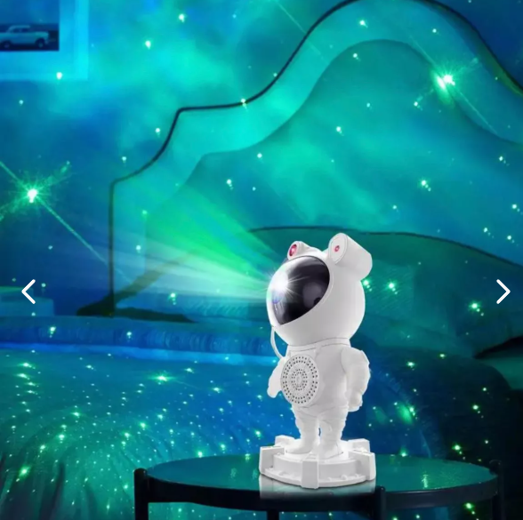 La cabeza de astronauta se puede girar 360 grados, permitiendo que la nebulosa gire en cualquier ángulo. Cuenta con un cable de carga y un control remoto para controlar los colores de las nebulosas e intensidad de las estrellas. Además también cuanta con 6 tonos de melodías relajantes nocturnos.